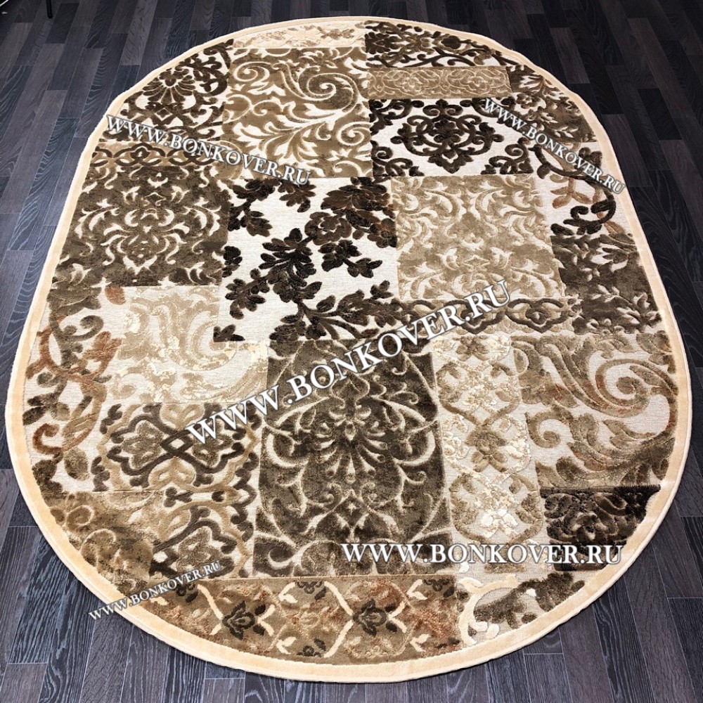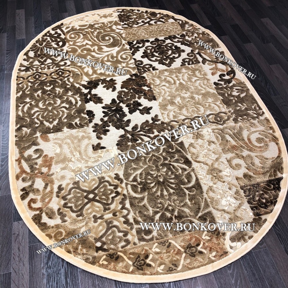 Ковер для Гостиной из Артшелка Дизайн 22 Бежево-Коричневый Овал станет превосходным дополнением интерьера, оформленного в современном или классическом стиле. Мягкое, но прочное, ковровое покрытие обеспечивает тепло- и шумоизоляцию, отличается длительным периодом эксплуатации, пожаробезопасностью, экологичностью и высокой износостойкостью, является отличным барьером от повышенной влажности в помещении и утеплителем для холодного пола. Благодаря качеству материалов, ковер не деформируется, сохраняет первоначальный вид под тяжестью предметов мебели. За его поверхностью легко ухаживать.